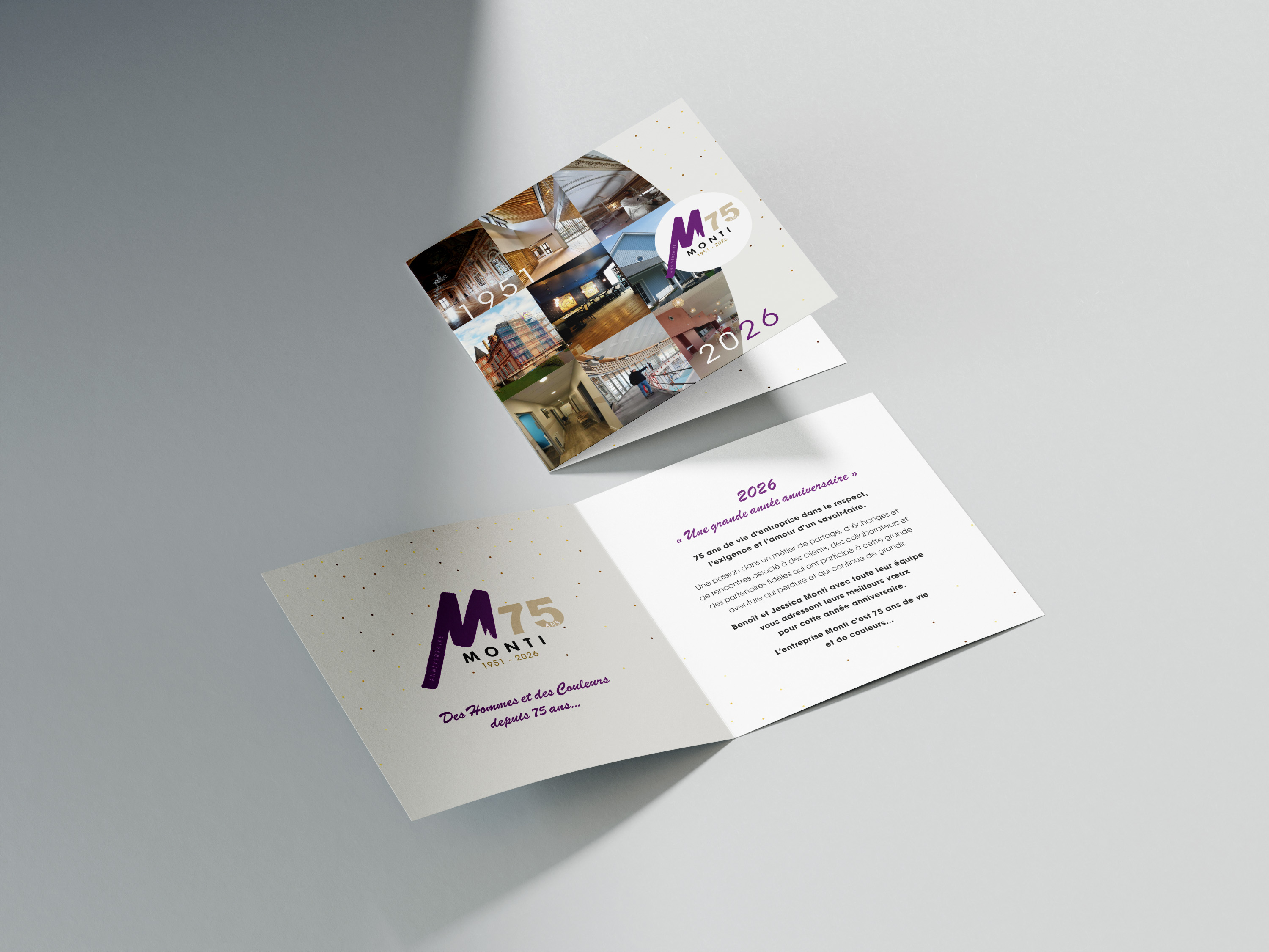 Le travail de création a été mené en étroite collaboration avec les équipes Monti afin de proposer un visuel à la fois institutionnel, élégant et porteur de sens. La carte de vœux s’inscrit ainsi pleinement dans la continuité de l’image de marque de l’entreprise, tout en apportant une dimension événementielle liée à ses 75 ans.